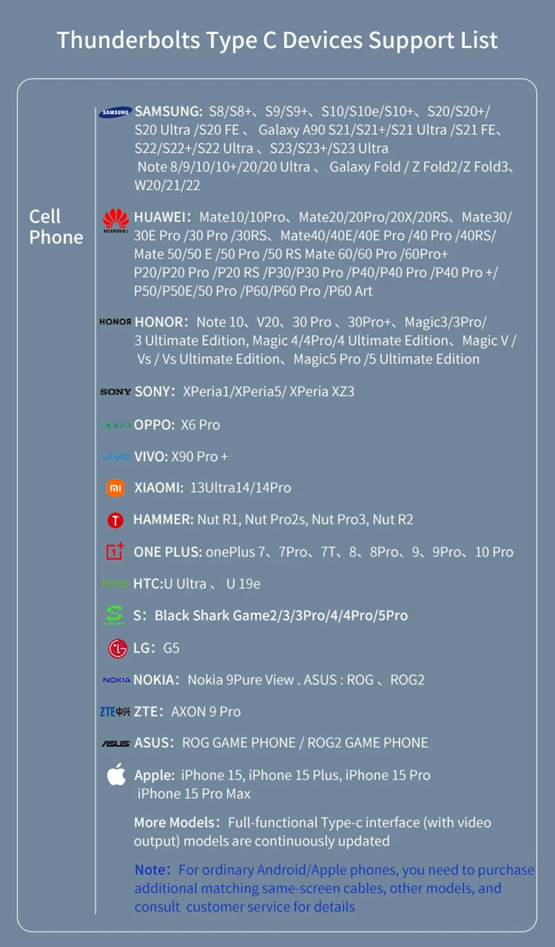 Phone Touch: Only support THUNDERBOLTS TYPE C phone.