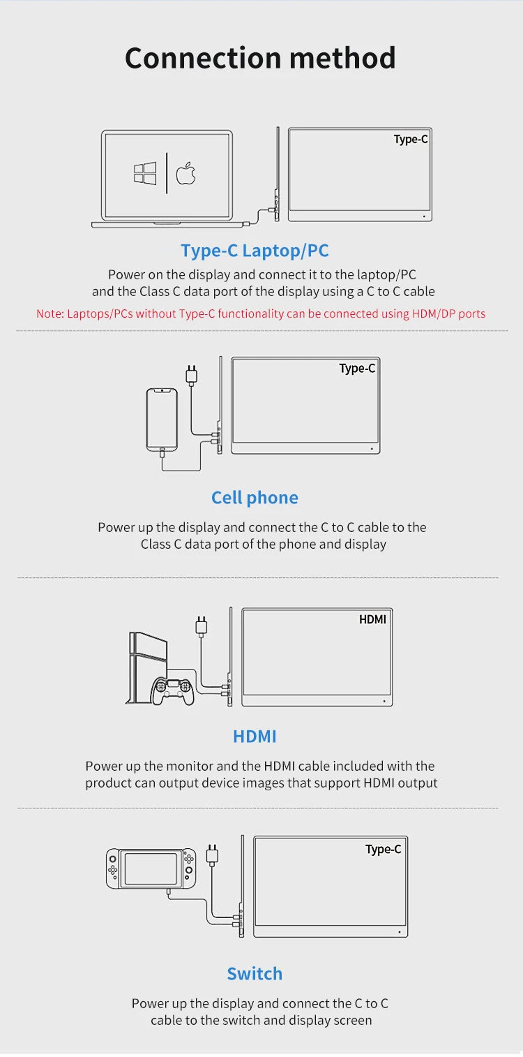 ·Experience Of Using Portable Mobile Display: Portable Display Is Used As The Auxiliary Screen Of Notebook Computer, Which Is Very Versatile. When A Laptop Is Connected To A Portable Display, It Can Become Two Screens, Which Can Display Content Simultaneously Or In Separate Screens. Split Screen Displays Can Also Do Many Interesting Things. It Feels Like A Person Using Two Computers. Portable Display Can Also Be Connected To The Mobile Phone.