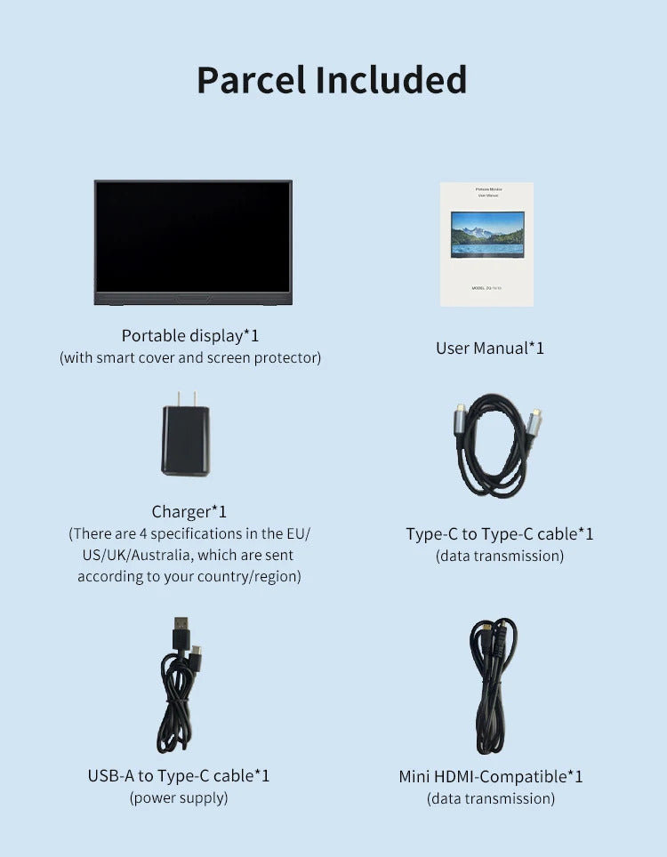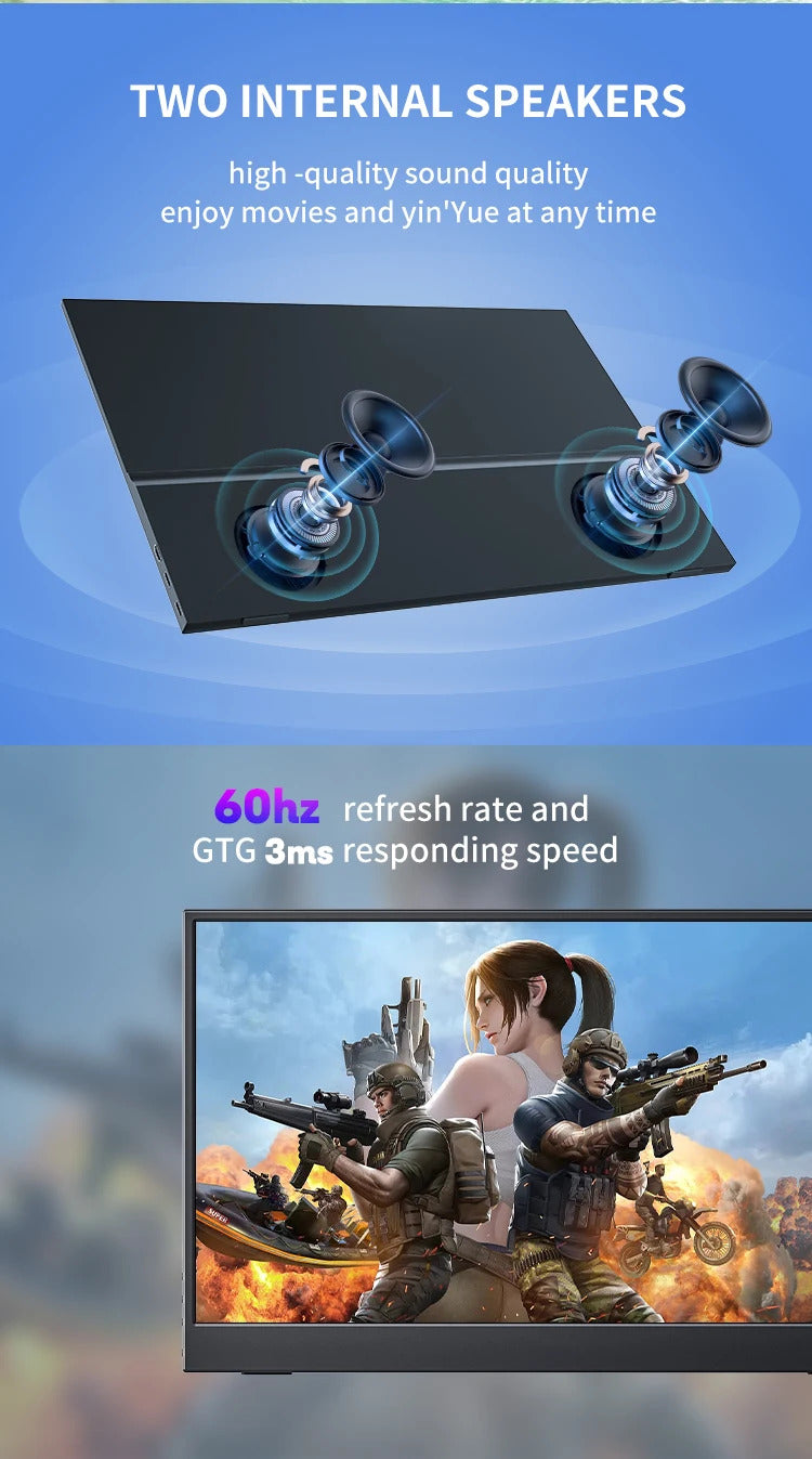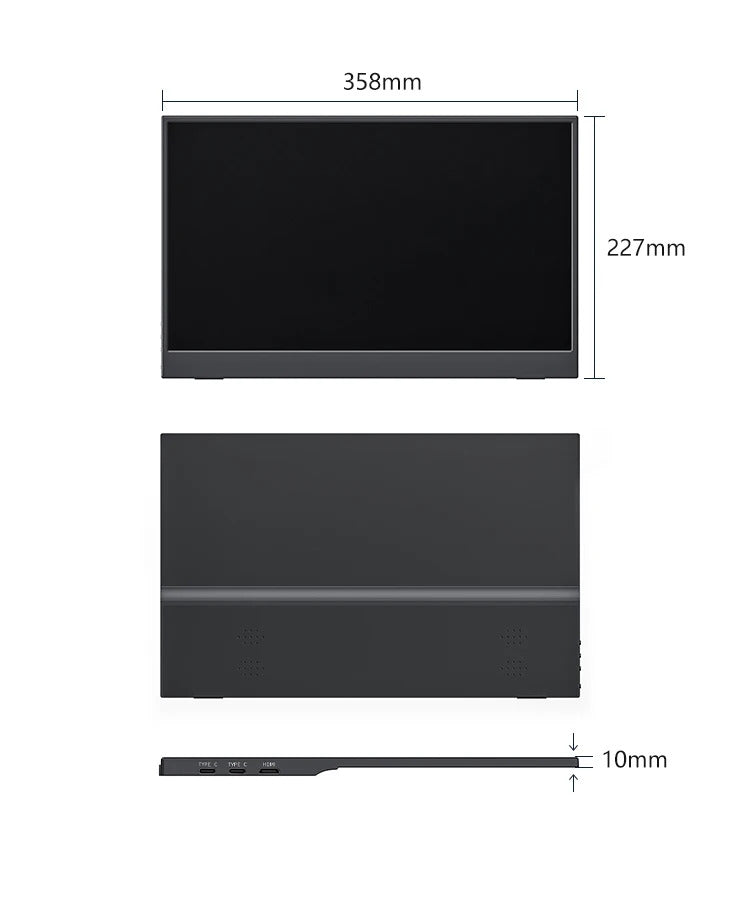 ·Appearance Screen Display Design: The Portable Display Is Designed With Three Narrow Borders. At Present, Most Portable Monitors Have A C-Type Power Port, A C-Type Data Transmission Port, A Mini HDMI Display Port And A 3.5mm Headset Port On The Side Of The Body. With 5 Buttons, You Can Turn The Machine, Related Settings And Other Functions On And Off.